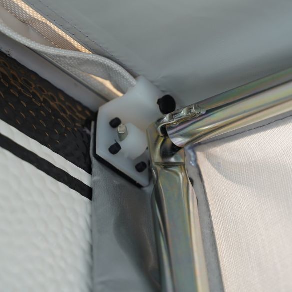 Vorderwand und Seitenwände haben außenliegende Erdstreifen mit Ösen an den wichtigen Punkten. Seiten-Eingang mit hohem Bogen-Reißverschluss.