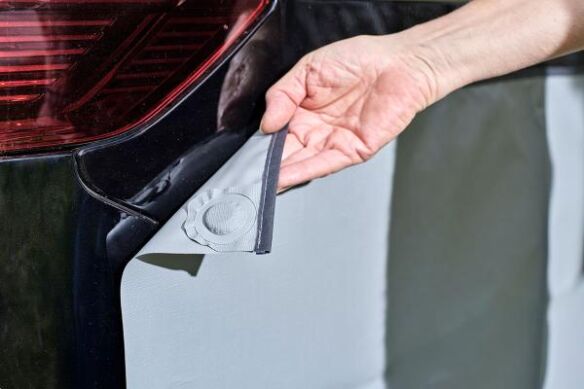 Die Campervan-Windblende ist zweiteilig: eine durchgehende Blende von Vorder- zu Hinterrad mit Ausschnitt für die Trittstufe und ein höheres Teil für den Radkasten. Sie ist aus strapazierfähigem PVC gefertigt, das eine lange Lebensdauer gewährleistet und vor Wind und Wetter schützt. Einfache und schraubenfreie Montage mit Magneten am Fahrzeug und Spanngurten an den Rädern.